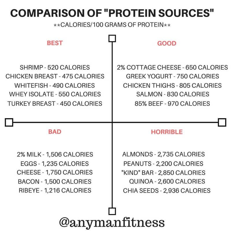 This graph shows how many calories you would need to consume to get 100 grams of protein from various food sources.